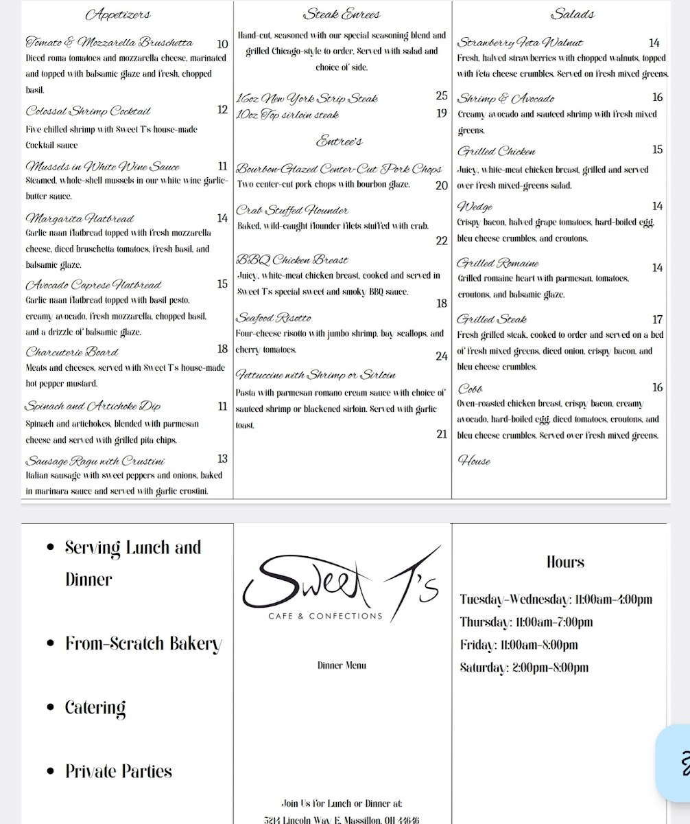 Welcome to Sweet T's Cafe and Confections, a charming culinary haven nestled in Massillon, OH. This delightful cafe boasts a diverse menu, perfect for those seeking exceptional flavors in a cozy atmosphere. Start with appetizers like the refreshing Tomato & Mozzarella Bruschetta or the exquisite Colossal Shrimp Cocktail. For entrées, the Crab Stuffed Flounder and Bourbon-Glazed Pork Chops showcase the commitment to fresh ingredients and bold flavors.